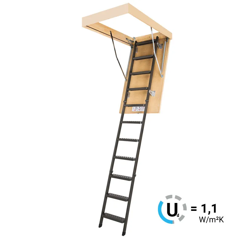 Модель EXTRA идеальна для условий, когда чердак плохо утеплен и требует дополнительной теплоизоляции. По контуру короба одинарный уплотнитель. Лестница имеет нескользящие ножки, которые идеально прилегают к земле, предотвращают появление царапин на поверхности пола и придают эстетичный вид после ее резки. 4-х секционная складная чердачная лестница. Высота потолка до 3350 мм.