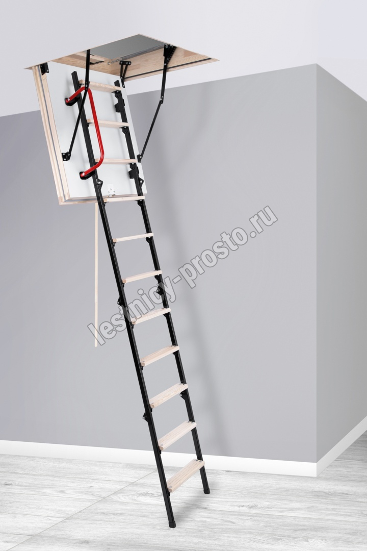 Складная 4-х секционная чердачная лестница. Ступени выполнены из сосны, имеют противоскользящие насечки, направляющие из металла.