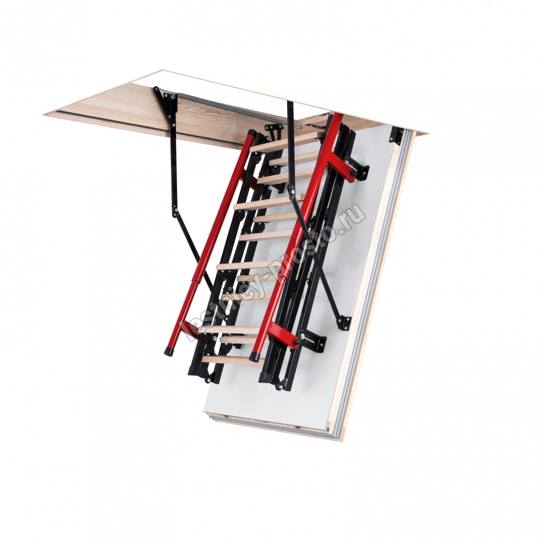 Лестница чердачная, складная, комбинированная 3-х секционная, металлические направляющие/деревянные ступени. Короб люка имеет двухточечную систему запирания. Телескопический поручень имеет внутреннюю пружину и при складывании лестницы служит механическим приводом, что облегчает процесс. Делает его полуавтоматическим. Оборудована дополнительной ступенькой на люке помогающей комфортно подниматься и спускаться. Термоизоляционная крышка типа "сэндвич", толщиной 86мм, утеплена пенопластом, облицована с двух сторон ДВП белого цвета. Лестница подходит для установки в местах с большими перепадами температур. Короб деревянный, высотой 170мм., по периметру проходит уплотнитель. Лестница выпускается для немецкого и английского рынка.