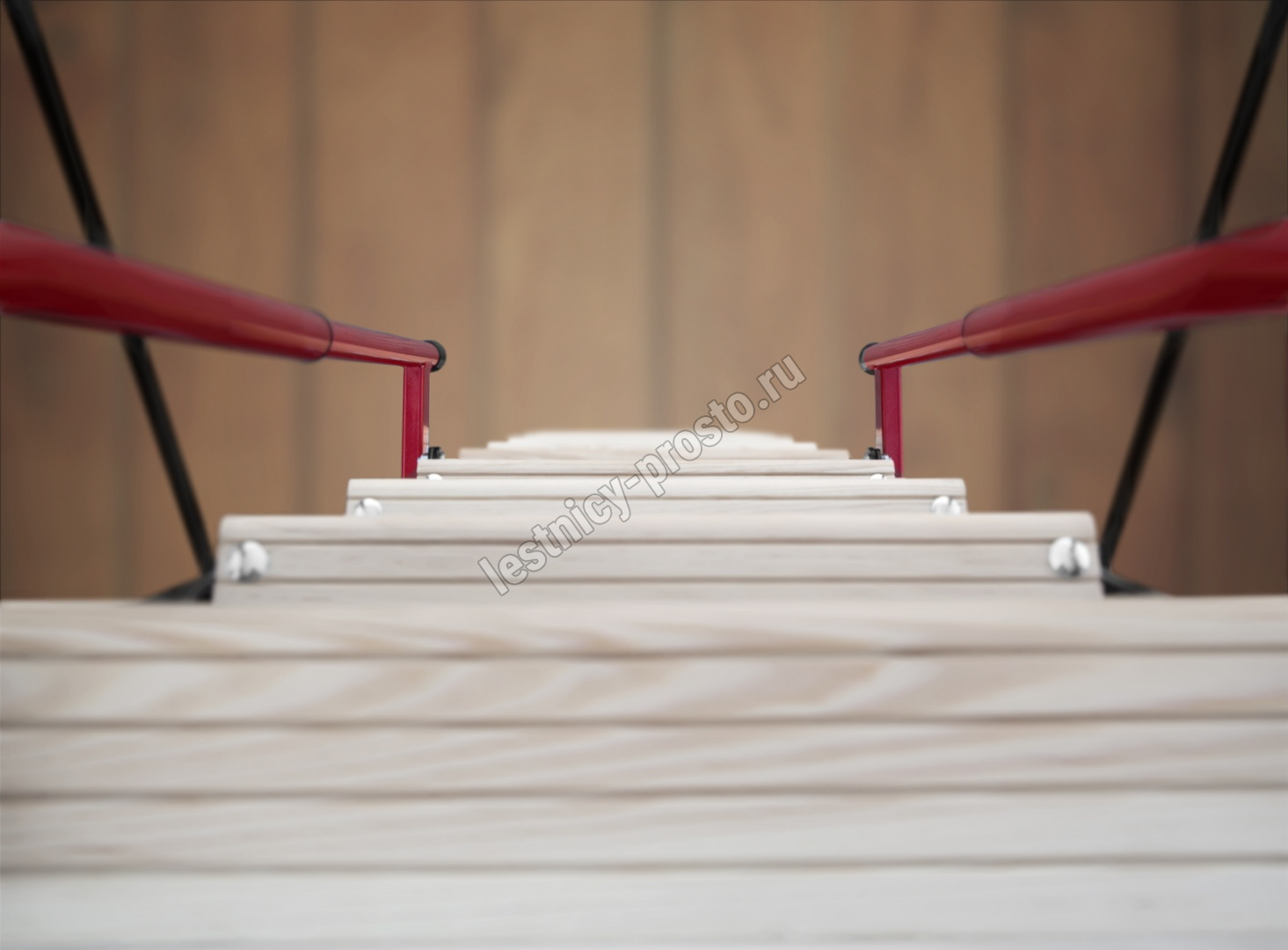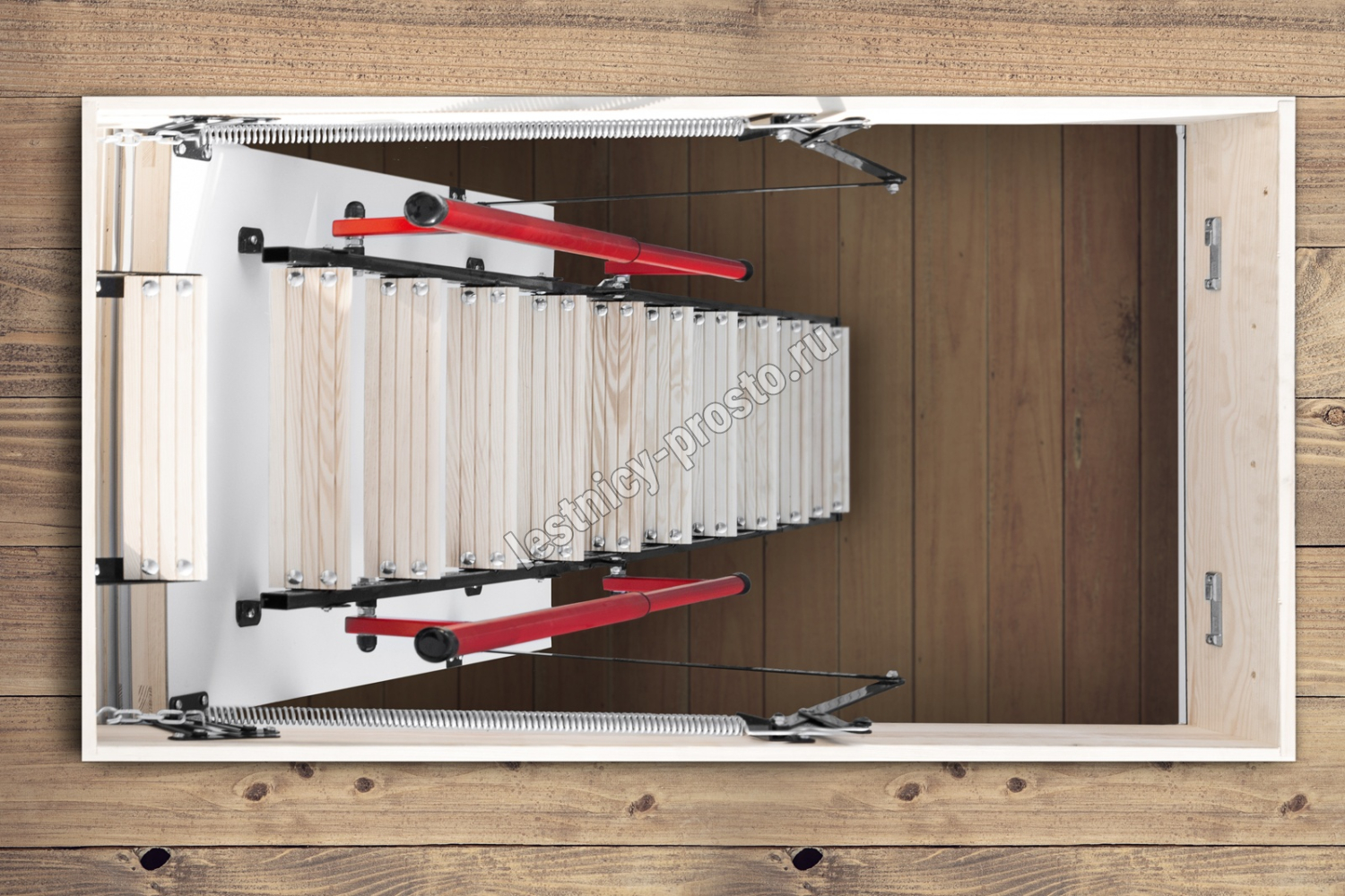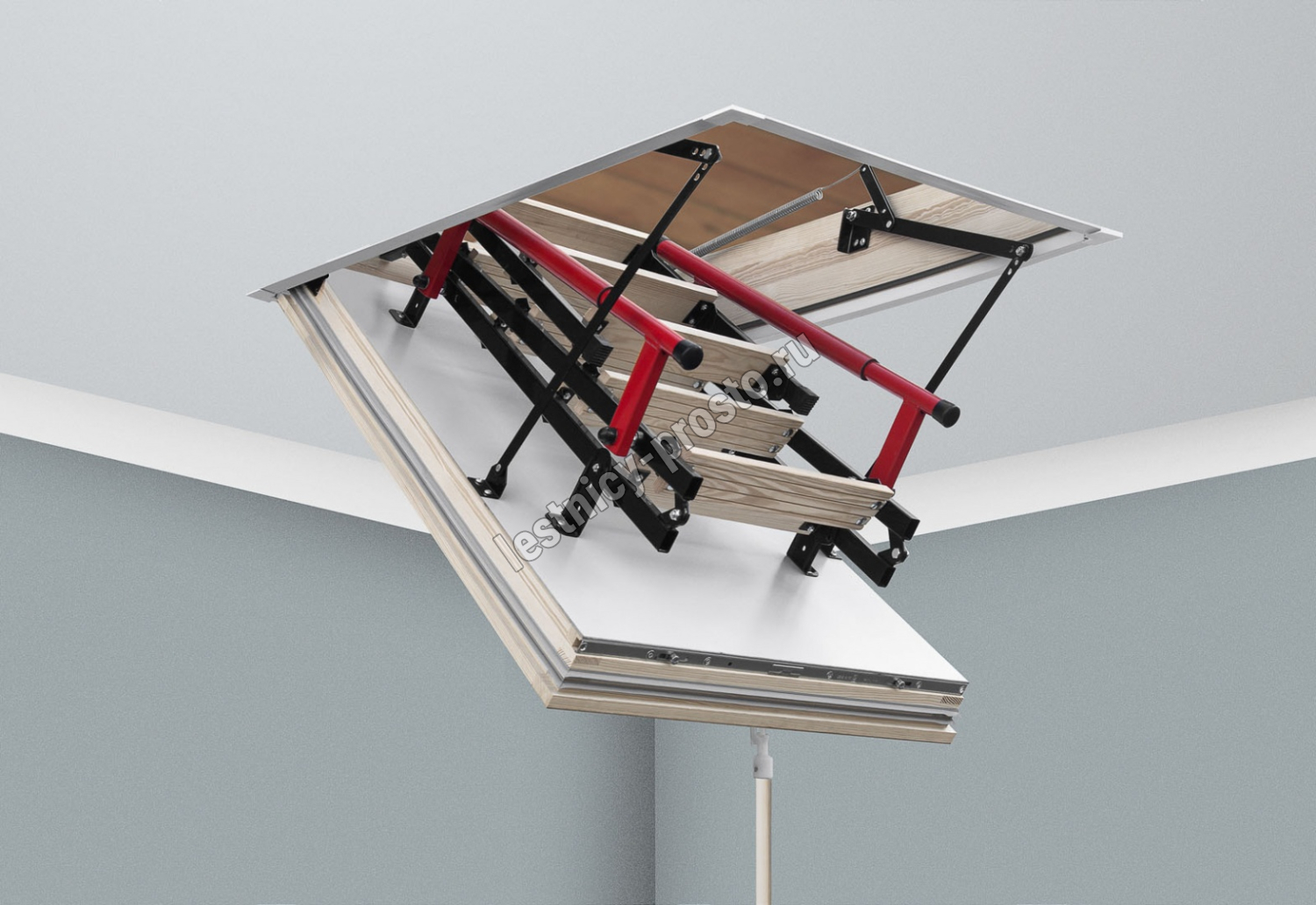 Лестница чердачная, складная, комбинированная 3-х секционная, металлические направляющие/деревянные ступени. Короб люка имеет двухточечную систему запирания. Телескопический поручень имеет внутреннюю пружину и при складывании лестницы служит механическим приводом, что облегчает процесс. Делает его полуавтоматическим. Оборудована дополнительной ступенькой на люке помогающей комфортно подниматься и спускаться. Термоизоляционная крышка типа "сэндвич", толщиной 86мм, утеплена пенопластом, облицована с двух сторон ДВП белого цвета. Лестница подходит для установки в местах с большими перепадами температур. Короб деревянный, высотой 170мм., по периметру проходит уплотнитель. Лестница выпускается для немецкого и английского рынка.
