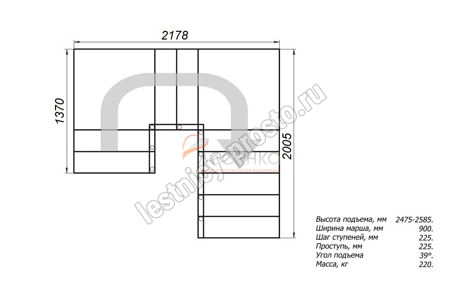 Модульная лестница Комфорт 225 2475-2585, Серый, Лиственница, Нержавеющая сталь