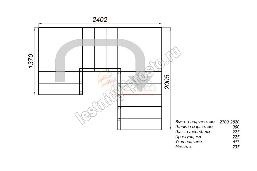 Модульная лестница Комфорт 225 2700-2820, Серый, Сосна, Крашеная, Без Ступений