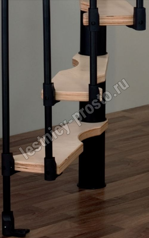 Компактная надёжная лестница. Ступени толщиной 30 мм, изготовлены из массива берёзы по технологии Multiplex, лакированные. Все металлические части оцинкованы, горячим способом и покрыты порошковой краской - черного цвета; Лестница имеет надёжную несущую стальную конструкцию.
