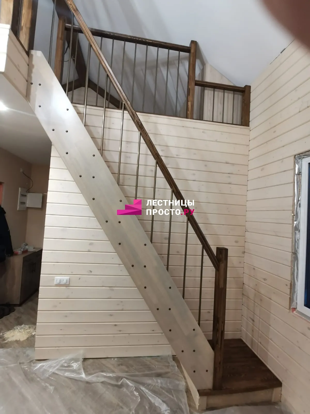 Лестница из сосны в частном доме с дополнительной балюстрадой